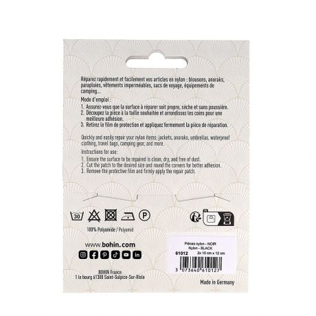 Les pièces de réparation autocollantes BOHIN permettent de réparer facilement les vêtements de sport, articles de voyage et de camping (tentes), accessoires (parapluie...), en viscose, polyamide, vinyle et autres tissus synthétiques lisses.