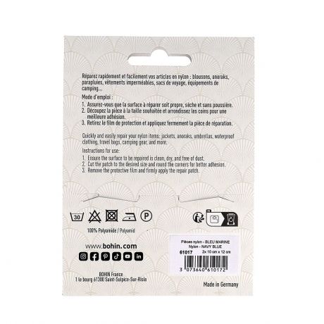 Les pièces de réparation autocollantes BOHIN permettent de réparer facilement les vêtements de sport, articles de voyage et de camping (tentes), accessoires (parapluie...), en viscose, polyamide, vinyle et autres tissus synthétiques lisses.