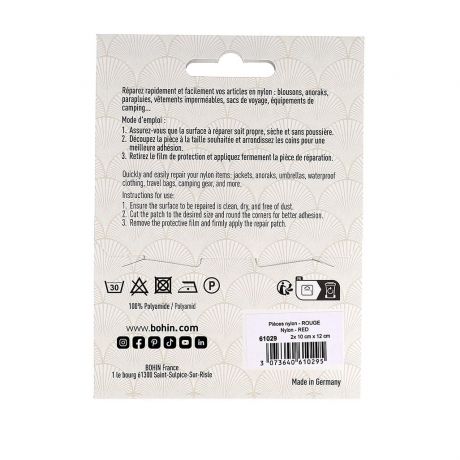 Les pièces de réparation autocollantes BOHIN permettent de réparer facilement les vêtements de sport, articles de voyage et de camping (tentes), accessoires (parapluie...), en viscose, polyamide, vinyle et autres tissus synthétiques lisses.