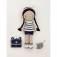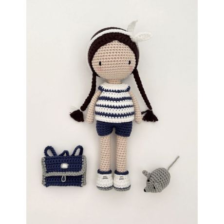 En choisissant cette pochette, vous allez pouvoir habiller et accessoiriser votre poupée au crochet avec une marinière, un short, des baskets, un ruban dans les cheveux, un cartable et une petite souris.