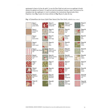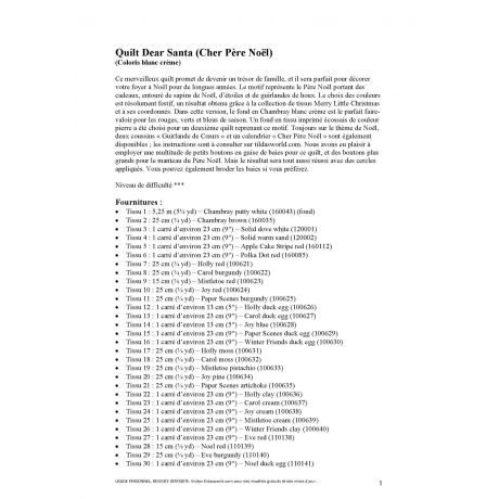 Ce merveilleux quilt promet de devenir un trésor de famille, et il sera parfait pour décorer votre foyer à Noël pour de longues années. Le motif représente le Père Noël portant des cadeaux, entouré de sapins de Noël, d’étoiles et de guirlandes de houx. Le choix des couleurs est résolument festif, un résultat obtenu grâce à la collection de tissus Merry Little Christmas et à ses coordonnés. Dans cette version, le fond en Chambray blanc crème est le parfait faire valoir pour les rouges, verts et bleus de saison. Un fond en tissu imprimé écossais de couleur pierre a été choisi pour un deuxième quilt reprenant ce motif. Toujours sur le thème de Noël, deux coussins « Guirlande de Cœurs » et un calendrier « Cher Père Noël » sont également disponibles ; les instructions sont à consulter sur tildasworld.com. Nous avons eu plaisir à employer une multitude de petits boutons en guise de baies pour ce quilt, et des boutons plus grands pour le manteau du Père Noël. Mais le résultat sera tout aussi réussi avec des cercles appliqués. Vous pouvez également broder les baies si vous préférez.