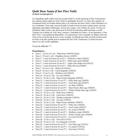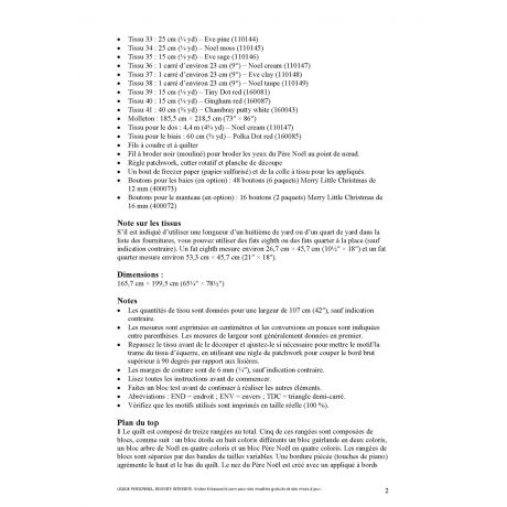 Ce magnifique quilt rendra Noël encore plus festif Le motif représente le Père Noël portant des cadeaux parmi sapins de Noël, étoiles et guirlandes de houx. Le choix des couleurs est résolument festif, un résultat obtenu grâce à la collection de tissus Merry Little Christmas et à ses coordonnés. Pour cette version du quilt, le fond en tissu écossais couleur pierre crée une charmante atmosphère folklorique, associé aux rouges, verts et bleus de saison. Un tissu en Chambray blanc crème a été choisi pour le fond d’un deuxième quilt reprenant ce motif
