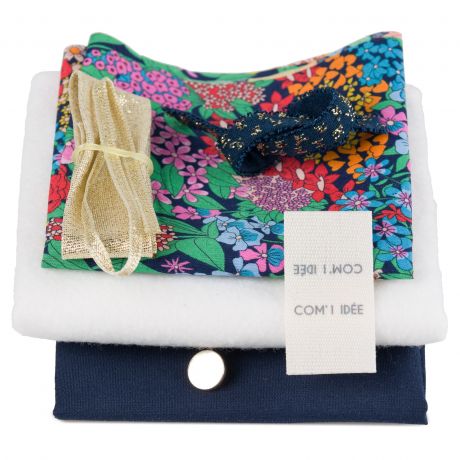 Kit pour réaliser une jolie petite pochette nomade pour ranger les bijoux. Ce projet est idéal pour apprendre à matelasser du tissu, poser du biais et fixer un bouton aimanté.