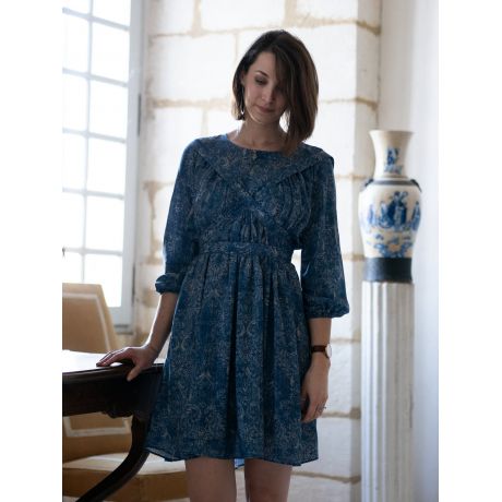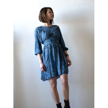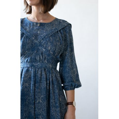 Le patron Anya de Ancea Paris c’est une robe drapée, à l’allure d’une robe du 18ème siècle. Sa différence est son confort et son ajustabilité. En effet elle ne possède ni fermeture éclaire ni corset. Elle se drape à l’aide de ses ceintures qui se nouent à la taille, permettant un ajustement parfait et modulable. De plus sa confection est facilité par cette technique de montage. Elle se caractérise par un empiècement triangle, ré-haussé par une ceinture croisée à la poitrine et ceinturée à la taille; du plissé pour mettre en avant la poitrine et apporter du volume à la jupe. Ses manches bouffantes 3/4 resserrées au poignet par un élastique sur l’ourlet de manche finissent de donner le ton à cette robe. Le dos se compose d’un empiècement arrondi prolongé d’une jupe froncée.