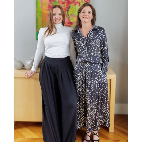 Le charme de Sanaz réside dans ses jambes extra-larges, structurées par des plis plats qui offrent un volume spectaculaire tout en préservant la fluidité. Cette coupe généreuse sublime les mouvements et crée une silhouette à la fois audacieuse et aérienne.
