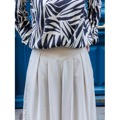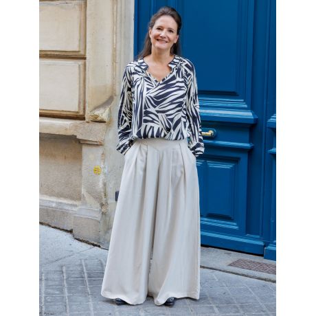 À réaliser dans un tissu fluide et non transparent de poids moyen — viscose, crêpe, tencel, lin léger ou satin de coton — pour garantir un tombé impeccable. Poids recommandé : 200–300 g/m² (5.9–8.8 oz/yd²).