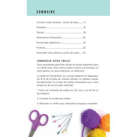 Grâce au livret, maîtrisez les points de base du crochet, comme le nœud coulant ou les mailles en l'air et finalisez votre projet grâce à la confection de pompons et de bordures.