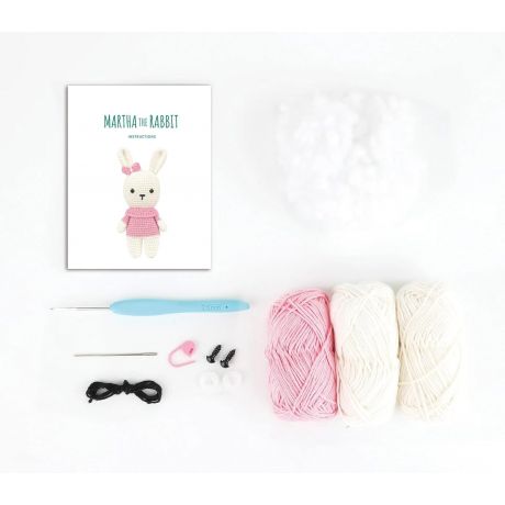 Les créatifs avec un niveau intermédiaire adoreront donner vie à ce petit dessin de Martha le lapin. Le kit contient tout ce dont vous avez besoin pour réaliser votre amigurumi, y compris du fil 100% Coton , un crochet, des accessoires, du rembourrage et des instructions.